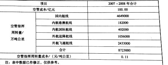 根據上述方法,統計2007年、2008年各類航線上的實際空管指揮周 轉量、航線運輸量及運輸收入 根據拉姆齊模型,將運輸基礎設施成本按照不同用戶需求彈性進行分 攤,可以得到最大化的社會福利,即價格彈性大的用戶負擔較少成本,價格 彈性小的用戶承擔較多成本。用戶價格彈性可采用相應航線上的運價表示。 按運輸量平均價格將空管成本在國際與國內國際快遞之間分攤要根據國際和國內國際快遞周轉量價格水平來分攤空管成本。設空管指揮總成本為C,國 內航線上應分攤的成本為CA,國際航線上應分攤的成本為Ca,對應航線 上的空管指揮周轉量為T、Ta,對應航線上單位運輸量的機票價格為P、 Pa,對應的分攤計算即為根據式計算得到國內國際快遞空管指揮周轉量成本為0.0701元/噸公里,國際國際快遞空管指揮周轉量成本為0.1656元/噸公