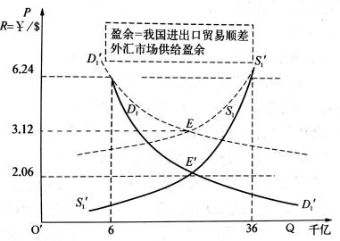事實上,當我國外貿商品外匯供給與需求彈性較大時,如D,與S:運行所示,人民幣貶值10%,即可以實現均衡。不過,由于經濟機理作用,均衡的E點并不是我們初始狀態的缺口4000億美元。因為供需曲線運行后交于E點,E點標識的均衡外匯供需市場規模是10000億美元,缺口是2000億美元。這2000億美元是我們通過國際物流達到如D:與S所示,人民幣需要貶值100%才可以達到均衡。同樣,這時的E’點標識的均衡外匯供需市場美元規模是10000億美元,缺口是2000億美元。這2000億美元是我們通過人民幣貶值達到的可預期的物流出口貿易規模。